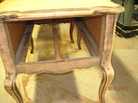 1. Start with a well made piece of furniture that has a great shape. These matching side tables and coffee table were screaming to be freed from their outdated shell! |